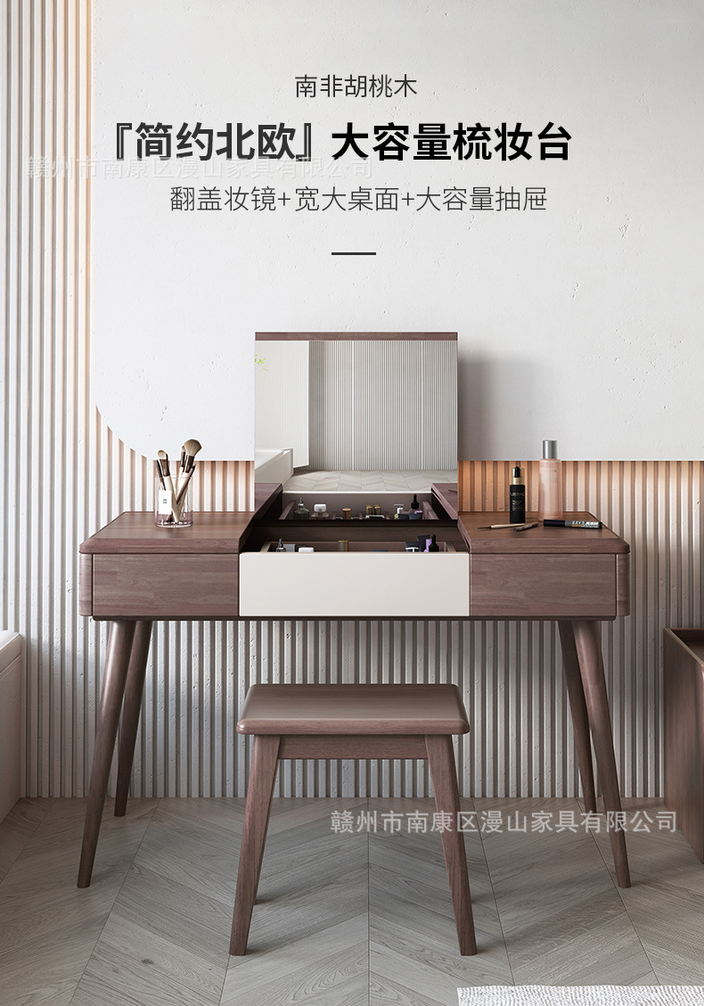 北欧胡桃木全实木梳妆台凳组合现代简约主卧室化妆桌多功能收纳柜