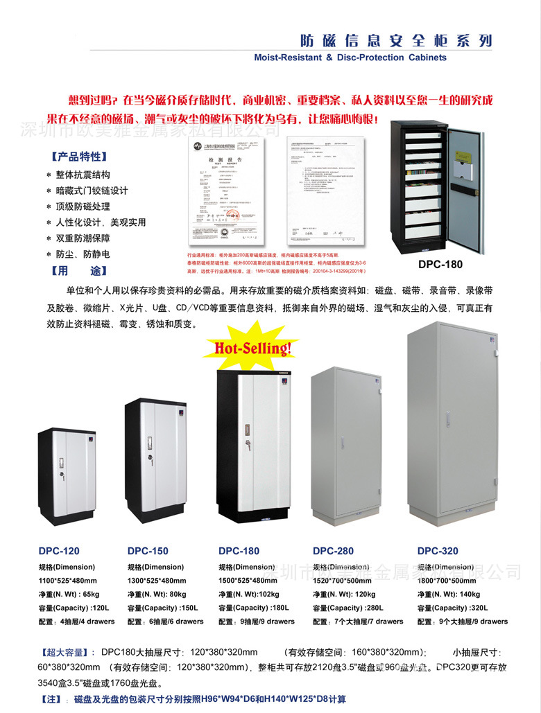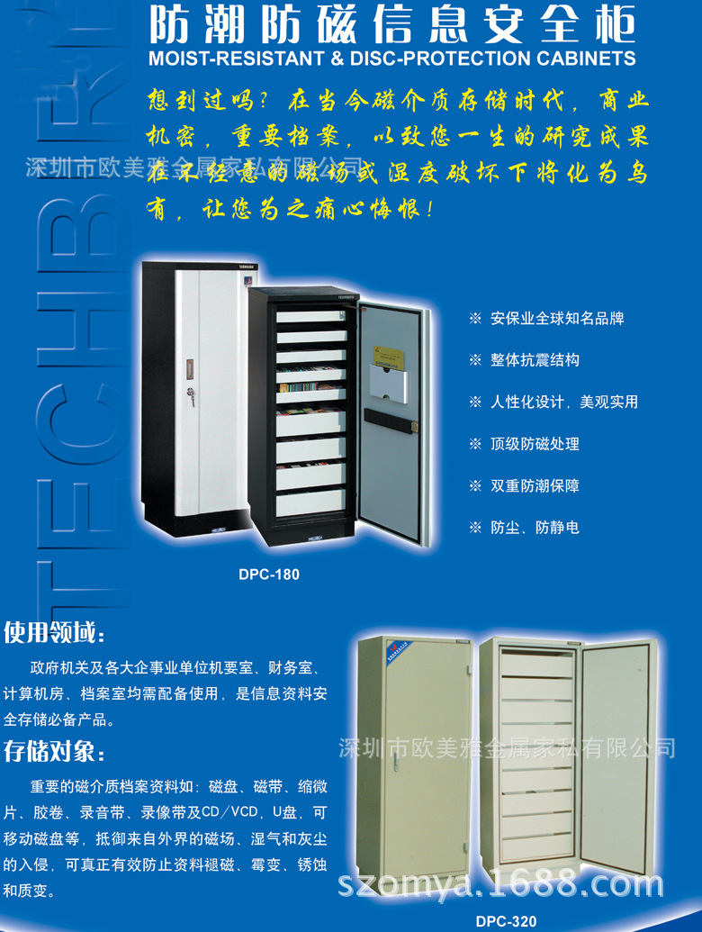 磁介质方面主要用于存放重要的磁介质档案资料如:磁盘、磁带、微缩片、胶卷、录音带、录像带及U盘、VCD/DVD、可移动磁盘,对温度、湿度、灰尘等外界因素高度敏感的存储介质,抵御来自外界的磁场、湿气和灰尘的入侵,可真正有效防止资料褪磁、霉变、锈蚀和质变。