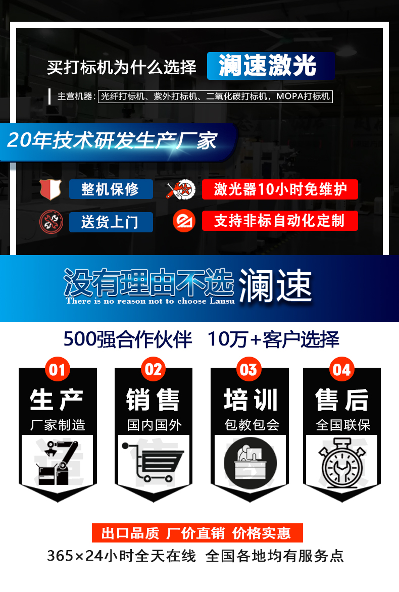 东莞市澜速激光设备有限公司是一家专注研发、生产、销售激光打标机、激光焊接机、激光切割机以及非标定制自动化设备,服务于国内上千家企业的高新技术源头厂家。澜速激光自成立以来,依托中国制造业基地的优势,与众多高校及研发机构建立了广泛的合作关系。 公司以市场为导向,以诚信为宗旨,积极进取,开拓创新,不断为广大用户提供优质的产品,专业的服务。