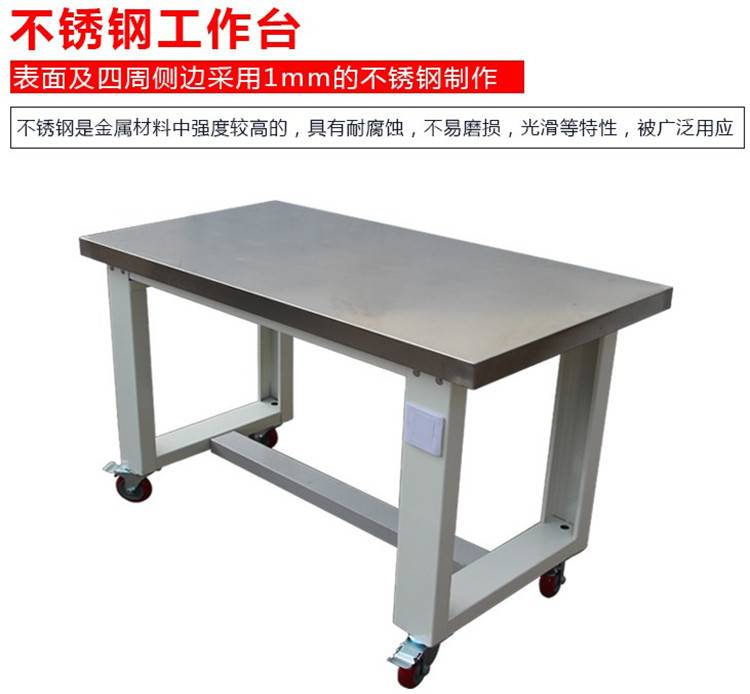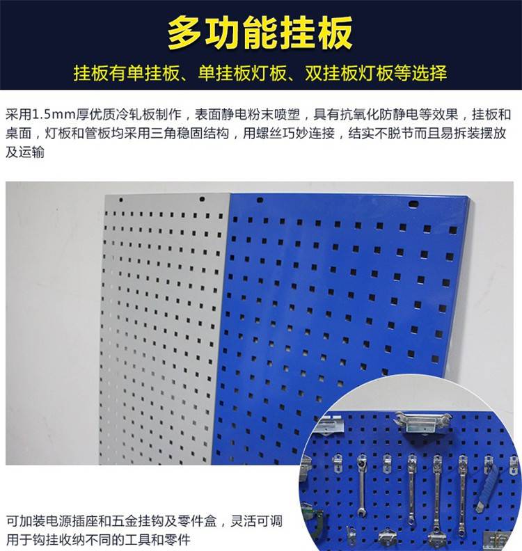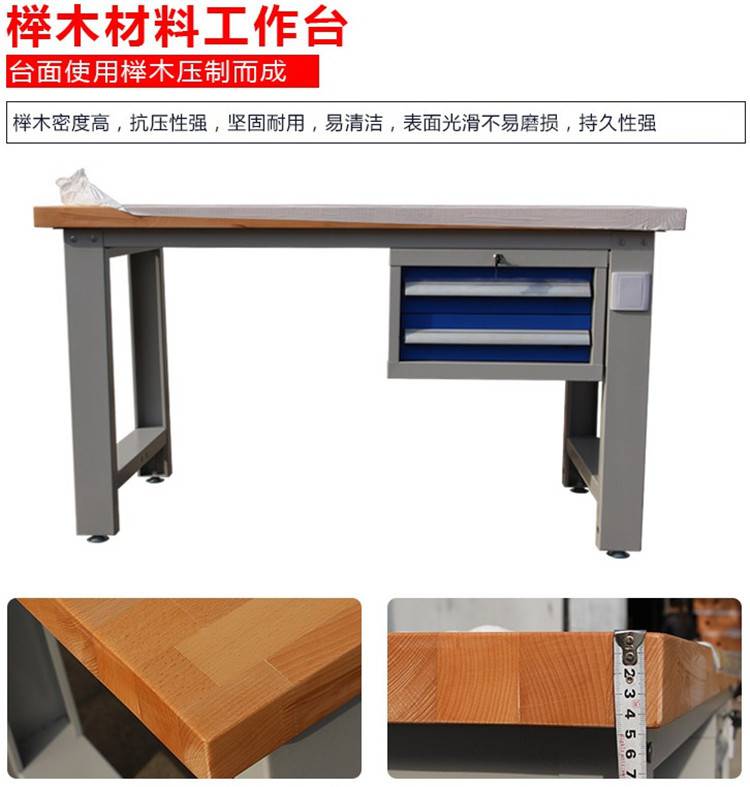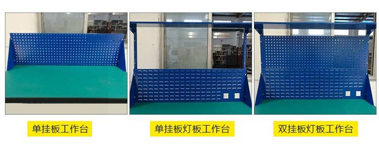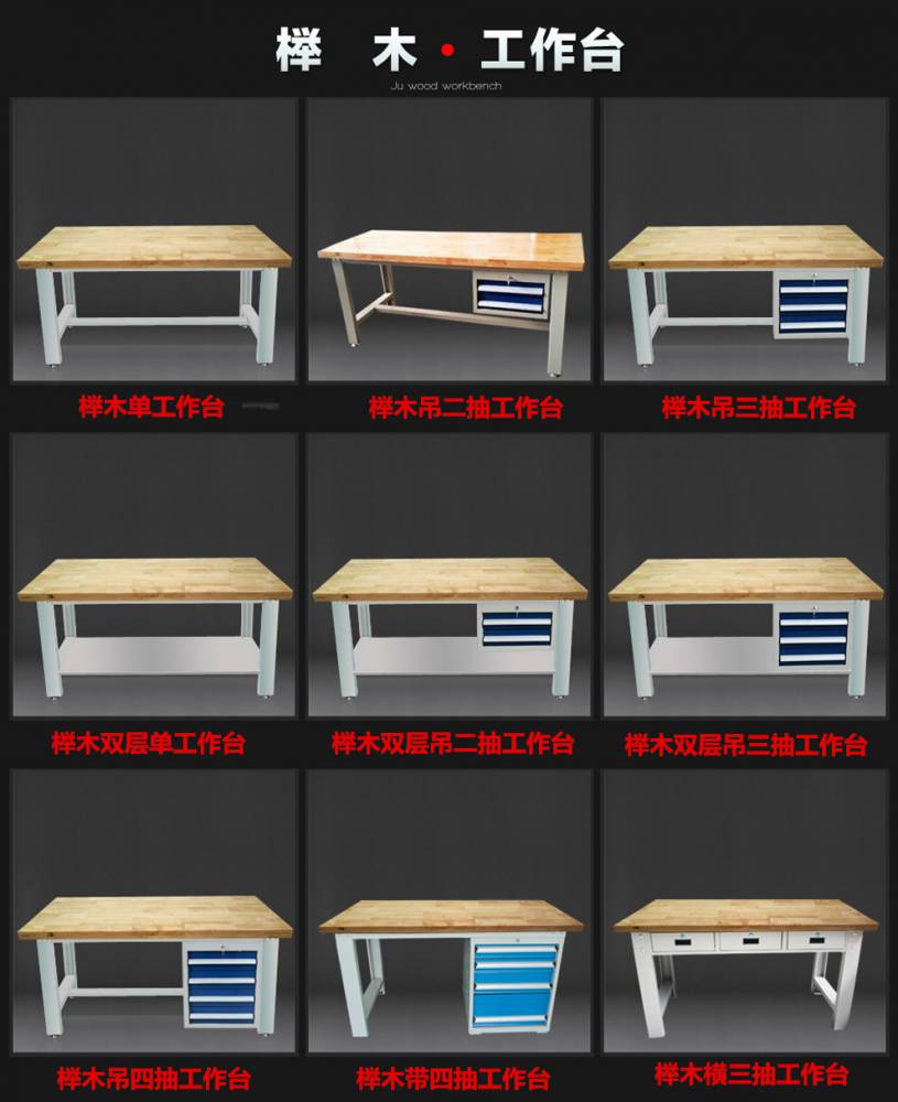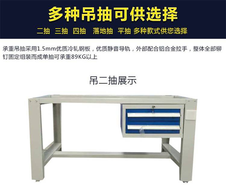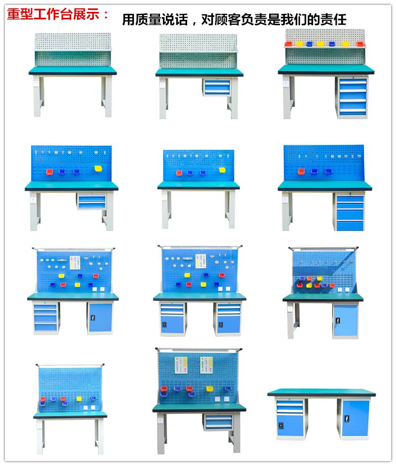 工作台采用优质冷扎板精工制作而成,坚固的工作桌框架,牢固平稳,可使工作桌承重1000kg;多种工作桌面选择,可配合不同使用的要求;工具吊柜(箱),侧柜(箱)灯架,调节脚杯,,外形美观;层板,抽屉质量上乘,承重大,抽屉内可根据需要任意分隔;节约空间,适用性强。
