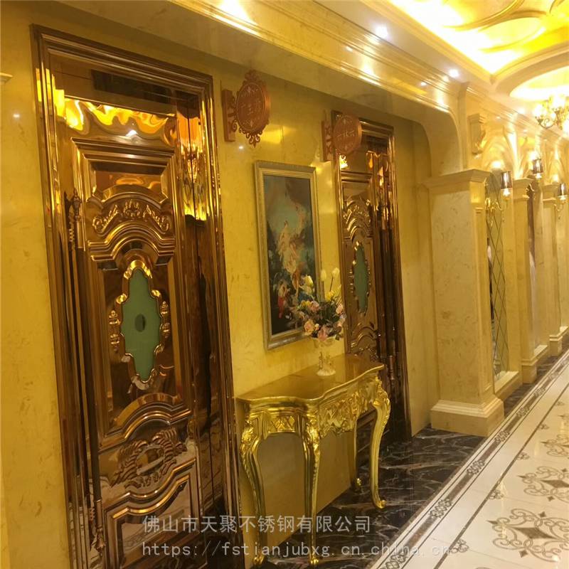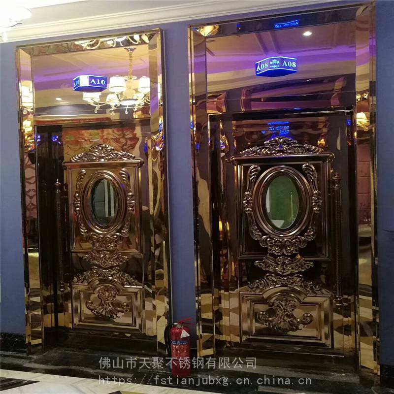 公司主要产品有不锈钢镀铜板,纳米仿古铜板,蚀刻板,喷砂板,乱纹板,镜面板。镀色玫瑰金,黑钛板,古铜板,玫瑰红,褐色等各种色板。哈尔滨KTV门板厂家 夜总会包厢门不锈钢压花门板 外凸好做门201玫瑰金镜面酒店会所包厢门用欧式不锈钢压花板 防火隔音门压花板