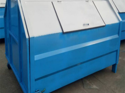 我公司现主要生产的3立方垃圾箱设计长为1800mm,宽1380mm,高1200mm。垃圾箱箱体厚度为2mm,箱盖厚度为1.5mm,上面两侧各有一个开门,左右两端一端为拉钩臂,一端为单开门,当钩臂被钩臂垃圾车拉起时,打开单开门,即刻把垃圾卸载掉,省力省时,环保。门四周安装有橡皮条,密封性好,不会进水或漏水,防锈漆和环保漆双层喷涂,既防腐,又美观。