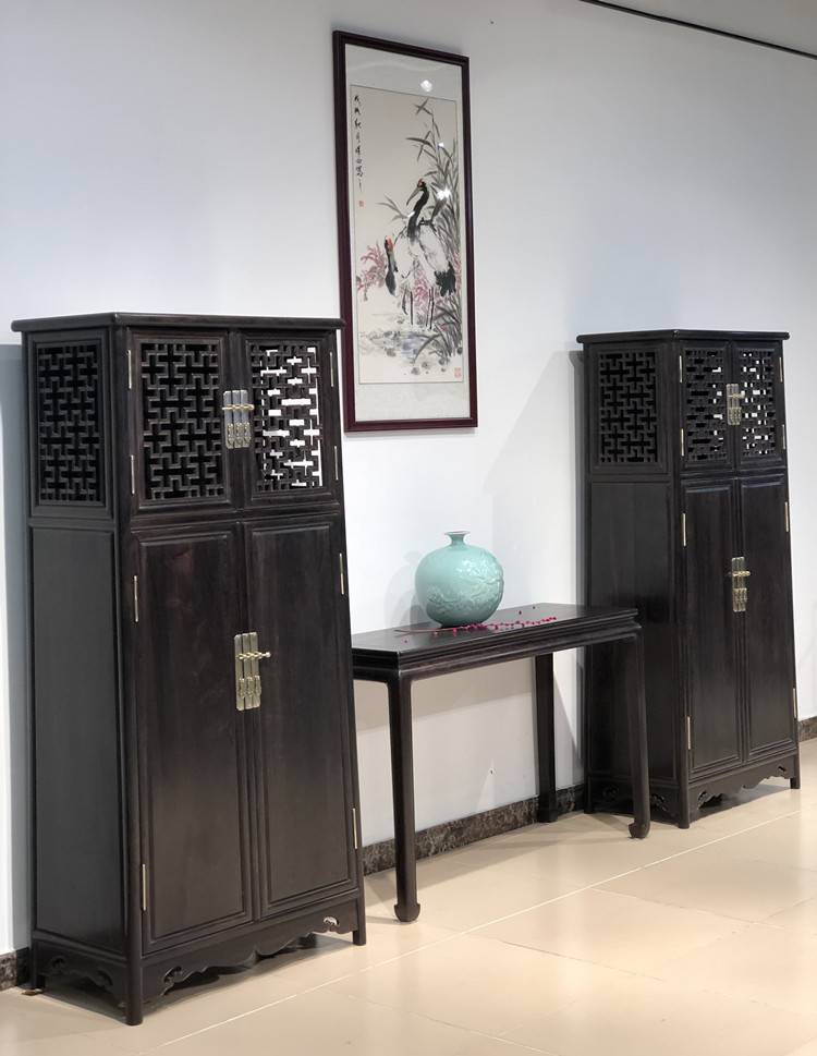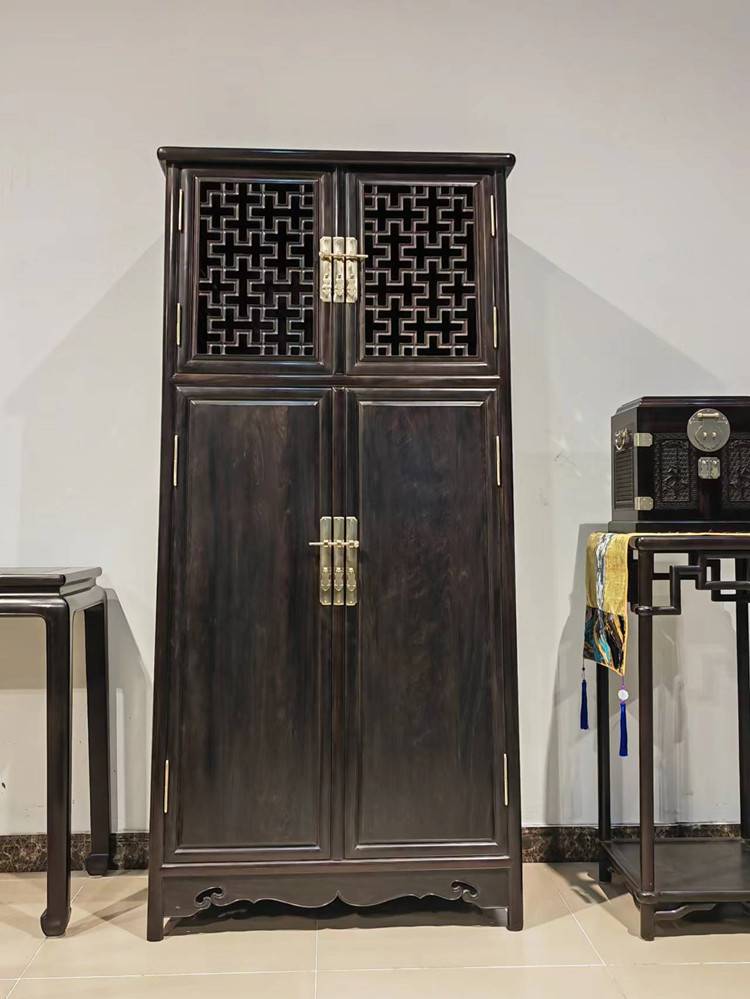 有一种柴木透格门柜,民间普遍使用以存放食物,除背板外,两侧及门均用直棂或用纵横材接成方格,透棂造成,使人能透柜内。透棂内可糊纱或任其透通。这类家具,在苏州一带称“饭橱”。现例冰绽纹透格门柜,就源自民间的饭橱。以珍贵木材如紫光檀或大红酸枝木制同类家具,用途应是放置观赏器物或图书而不是食物,而透棂亦有较富装饰性的图案如现例的卍字纹