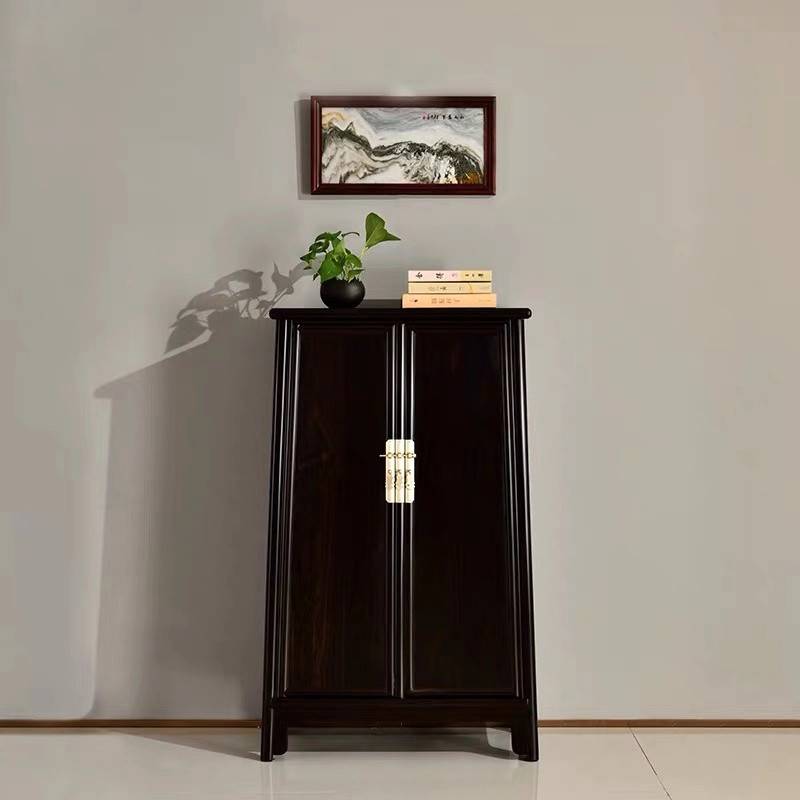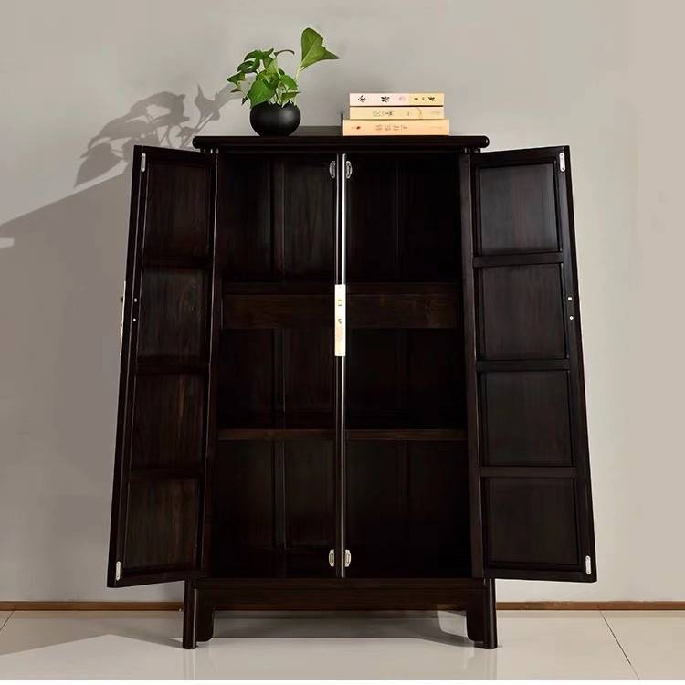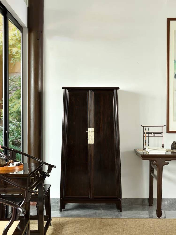 圆角柜的四足自喷面的柜帽下展出,些微外斜的侧脚,整器A字型,这种下舒上敛的设计,使柜体优雅、平衡稳固。同时,在给人的视觉上毫无压迫之感,远观重心在下,四平八稳;近观,两边线条逐渐朝外扩张,舒展自如。柜门大边上下两端伸出门轴,纳入柜身框上下的臼窝,以轴门旋转开启。令柜身无需铜活合叶,整体线条利落清爽,一气呵成。