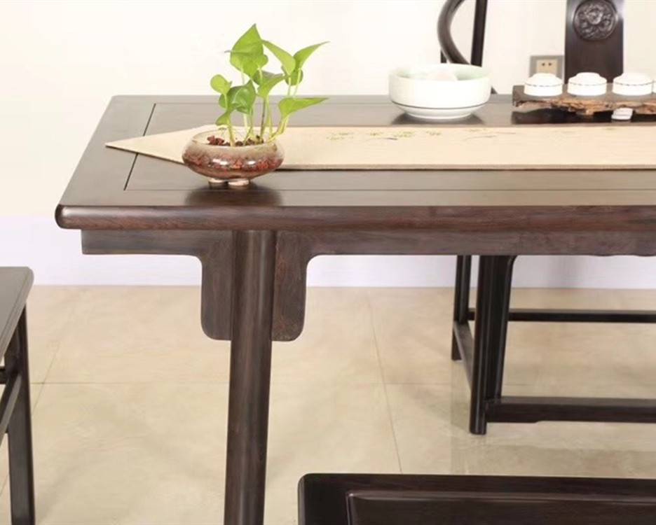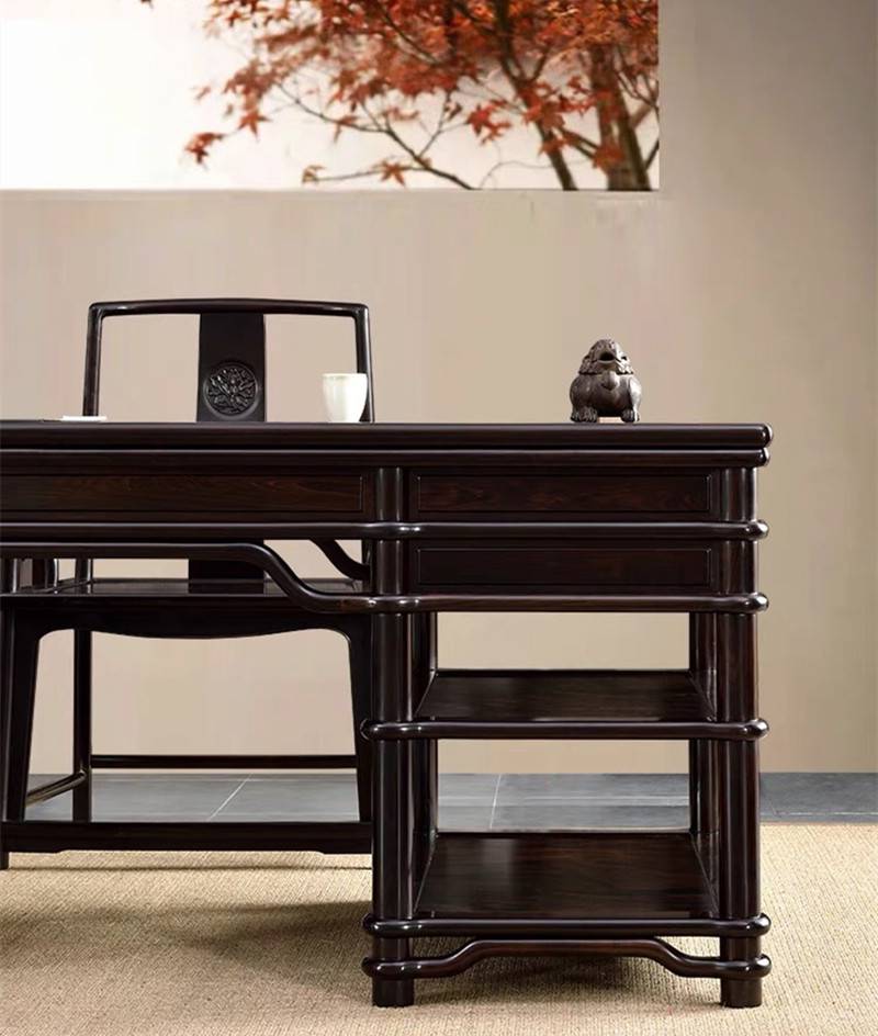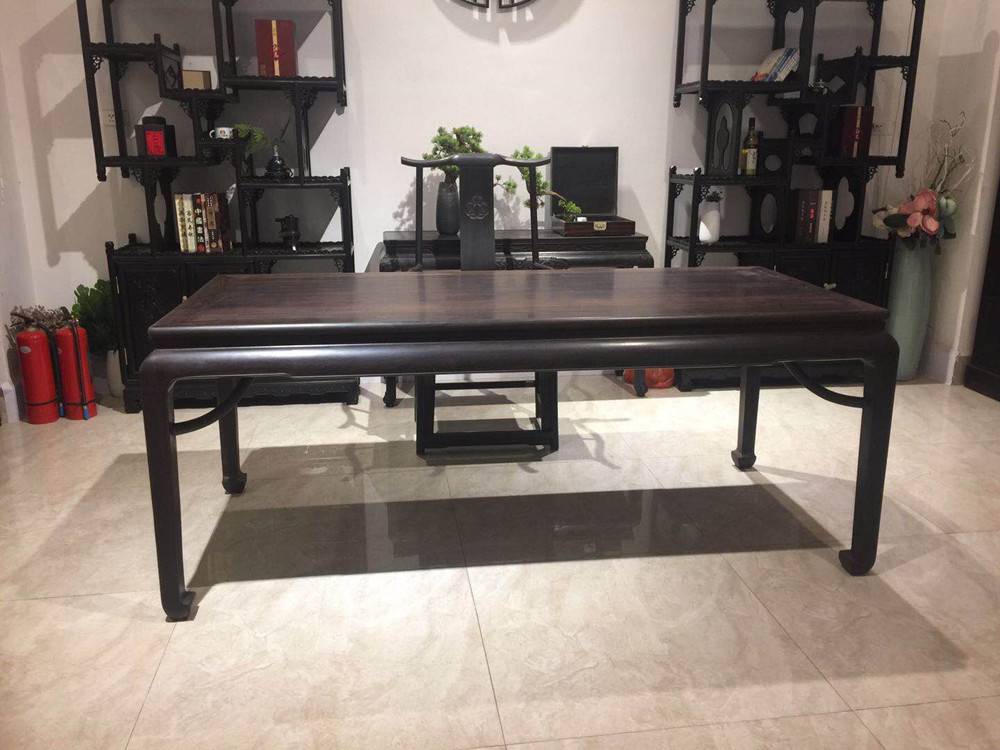 一件品相俱佳的紫光檀红木办公家具,形、韵、艺、材是基本要素。一要造型创意好;二要料好工精;三要磨光润泽好。