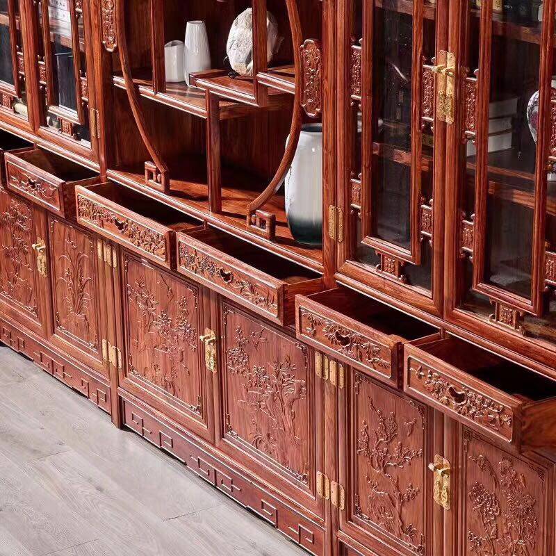 中山市大涌镇名琢世家红木家具厂,红木书房家具,办公家具厂家,刺猬紫檀三组合书柜,素面书柜,雕花书柜,三组合书架,博古柜,博古架,款式尺寸多。工厂直营批发。