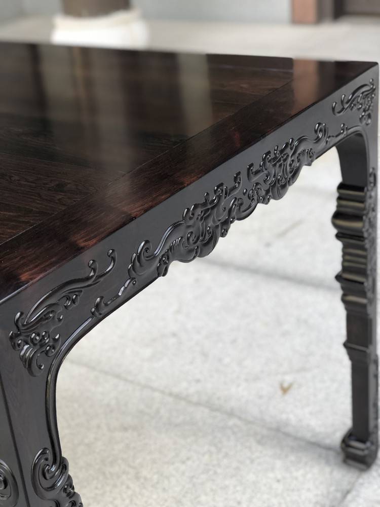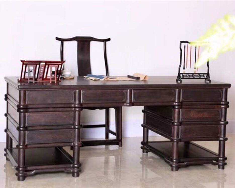 一件品相俱佳的紫光檀红木办公家具,形、韵、艺、材是基本要素。一要造型创意好;二要料好工精;三要磨光润泽好。