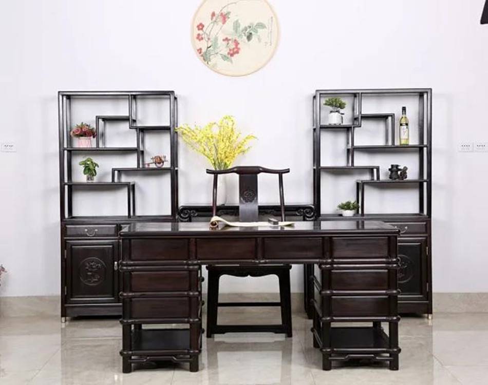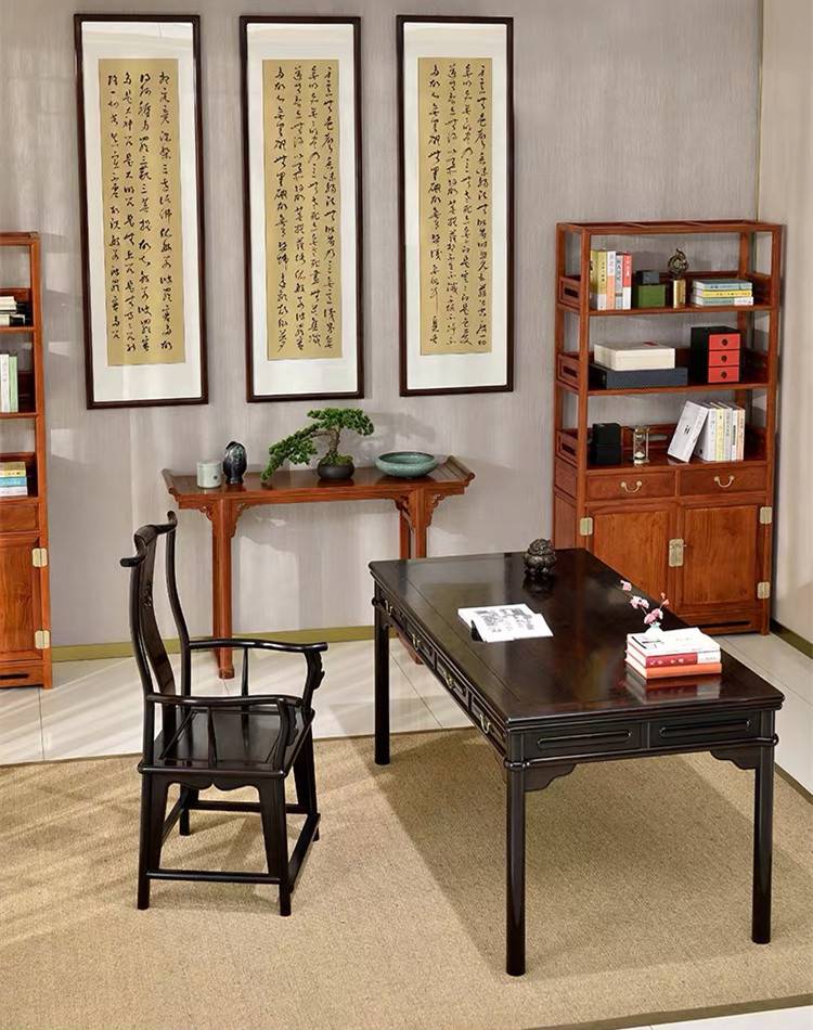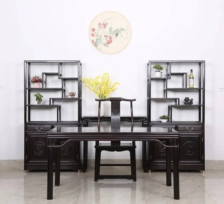 如在古典家具设计中,使用黄色或红色系的红木,或者细腻的黄杨这样暖色调的木料与东非黑酸枝搭配,作为一种色调上的补充,可以使家具在稳重的气氛中出生动,达到和谐而不压抑的意境。适于制作成堂的仿明式或清式厅堂家具、书房家具,可以达到文雅中突出沉静穆古的氛围。