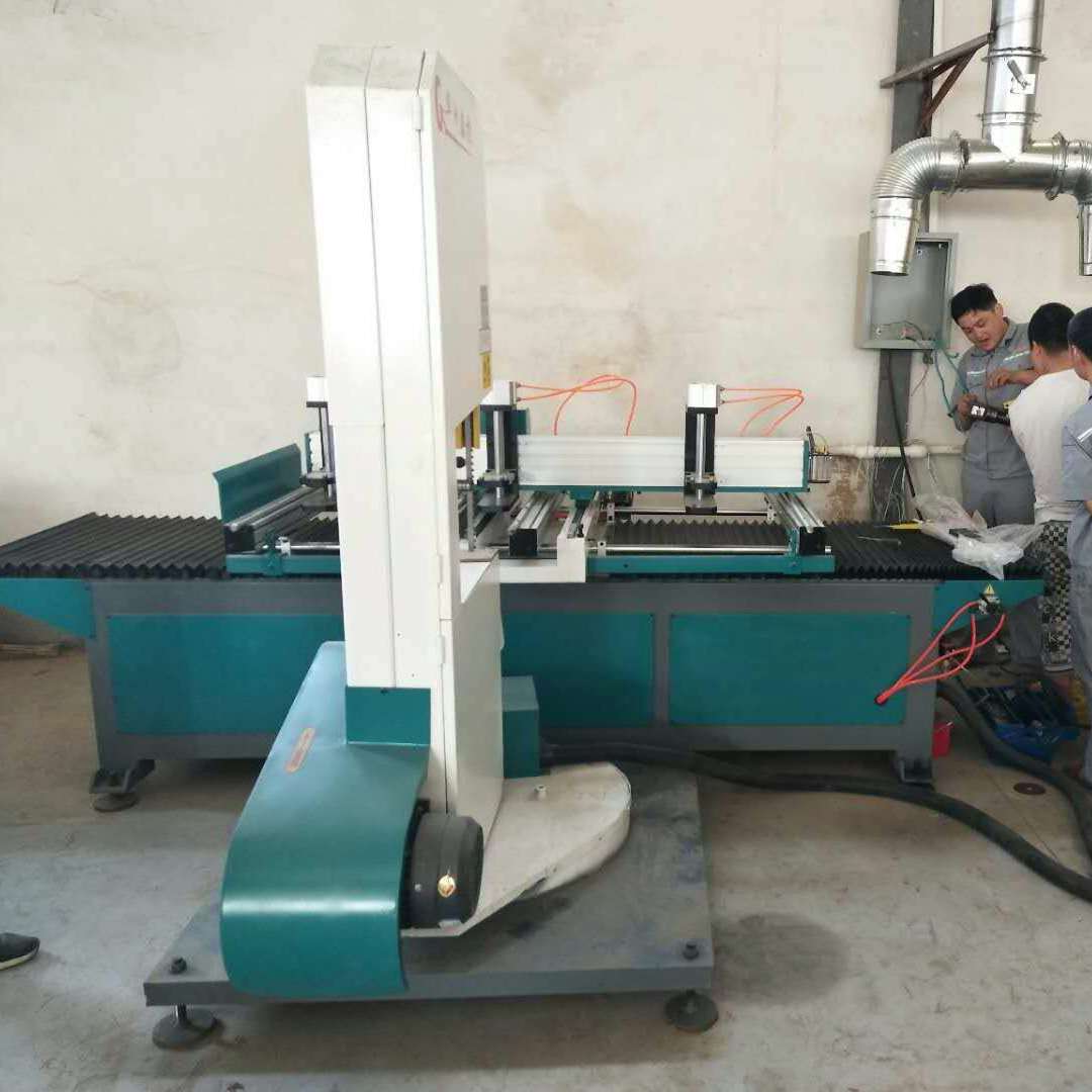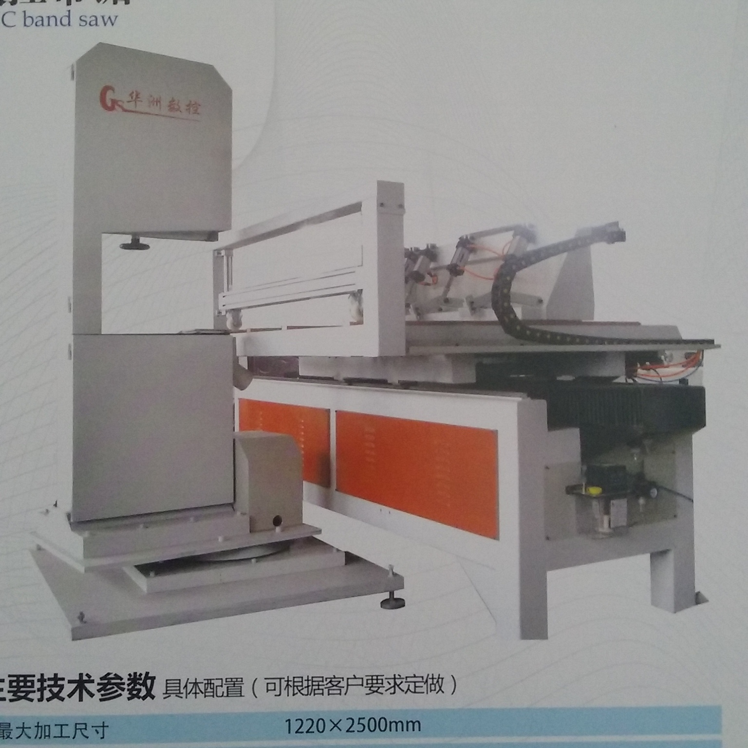华洲数控带锯锯条的宽窄应合作恰当。斜面锯法锯割斜面时,可将机床作业台面倾斜到所需的视点。锯轮分有幅条式的锯轮和幅板式的锯轮;立式锯一般下锯轮为主动轮,上锯轮为从动轮,上锯轮的重量应比下锯轻2.5~5倍。带锯条的切削速度通常为30~60m/s。上锯轮升降装置用于装卸和调整带锯条的松紧;上锯轮仰俯装置用于防止带锯条在锯切时从锯轮上脱落。带锯条张紧装置则能赋予上锯轮以弹性,带锯条在运行中张紧度的稳定;旧式的采用弹簧或杠杆重锤机构,新式的则采用气压、液压张紧装置。导向装置俗称锯卡,用以防止锯切时带锯条的扭曲或摆动;下锯卡固定在床身下端,上锯卡则可沿垂直滑轨上下调节;锯卡结构有滚轮式和滑块式,滑块式系用硬木或耐磨塑料制成。