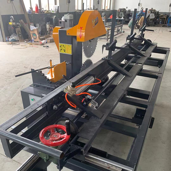 新型木工机械(圆木推台锯),有带锯的性质,但功效是带锯的四倍以上,圆木可自然开片,全部开片,可取方料,避免带锯锯弯,挖坑的现象。推台锯安全性高,锯面光滑平整,适合短木料硬杂木、大口径圆木,规格可调节,靠尺移动方便、准确。滑道采用直线导轨,准确无误差,耐磨。本机采用两台独立电机,方便用户,锯小直径圆木时可开一台电机(特殊型号可定制)