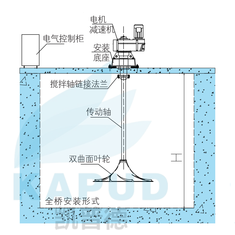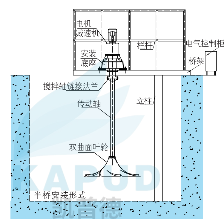 干式安装的搅拌机先将减速机机架固定在工作桥上,然后只需依次安装传动轴,叶轮部件,并固定好电缆,见干式安装示意图。