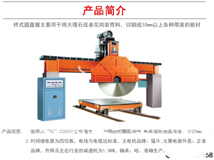 桥式圆盘锯石机主要用于将大理石或花岗石荒料,切割成10mm以上各种厚度的板材。