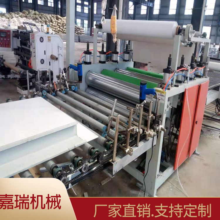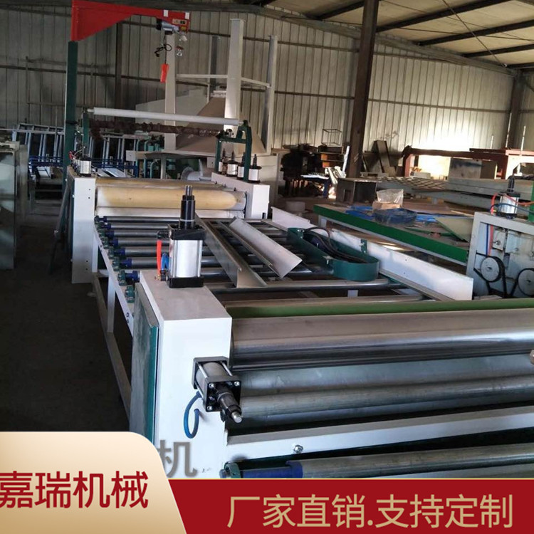 设备配置:除尘吸尘机构,单独涂胶水机构、放纸贴纸机构、自动切纸机构、热压机构。设备特点:自动放卷、纠偏放斜、速度可调、静电消 除、除尘、预加热、涂胶、热压及冷压。设备主要特征:1:设备配有吊机,更换卷材时可一人操作。2:单独表明除尘系统配备相应的吸尘器,让贴涂表明无瑕疵。3:每个独 立单机都有紧急开关,可避免事故发生。4:采用气压成型可以让表面受力可控制大小,淘汰老式贴纸机使用弹簧做压力单一的性。5:变频调速再配备大功率电机让机器整体速度一致,工作时每块板材间距一致。6:涂胶采用 离合装置,表明涂胶更均匀。7:冷压和热压于一体可在板材成型以后立马使用,不开胶。