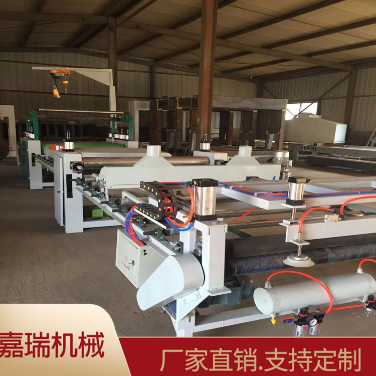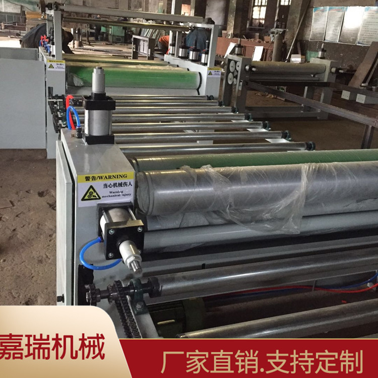 设备配置:除尘吸尘机构,单独涂胶水机构、放纸贴纸机构、自动切纸机构、热压机构。设备特点:自动放卷、纠偏放斜、速度可调、静电消 除、除尘、预加热、涂胶、热压及冷压。设备主要特征:1:设备配有吊机,更换卷材时可一人操作。2:单独表明除尘系统配备相应的吸尘器,让贴涂表明无瑕疵。3:每个独 立单机都有紧急开关,可避免事故发生。4:采用气压成型可以让表面受力可控制大小,淘汰老式贴纸机使用弹簧做压力单一的性。5:变频调速再配备大功率电机让机器整体速度一致,工作时每块板材间距一致。6:涂胶采用 离合装置,表明涂胶更均匀。7:冷压和热压于一体可在板材成型以后立马使用,不开胶。