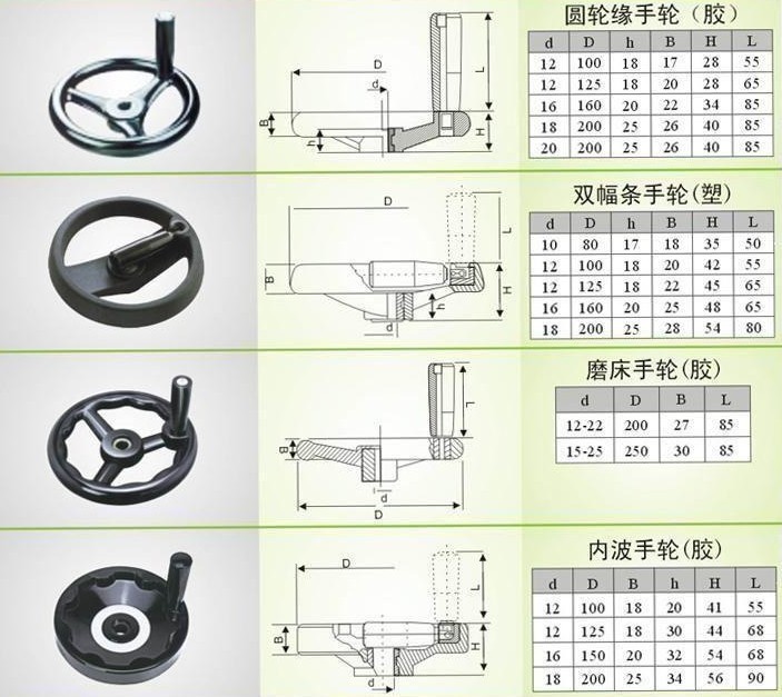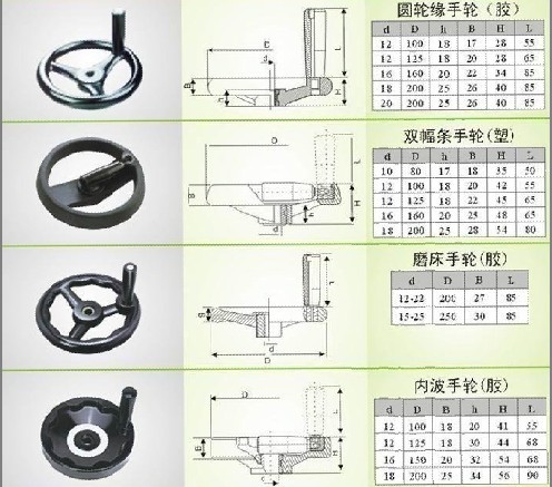 胶木手轮,尼龙手轮,塑料手轮,铝合金手轮,铸铁手轮,背波手轮,内波手轮,波纹六星手轮,双幅条塑料手轮,双幅条铝手轮,实心手轮,压花数字表,压花数字手轮