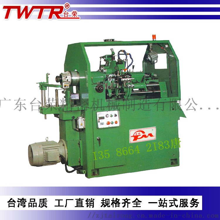 凸轮组:凸轮轴系由主动力马达带动中间皮带轮,以顺时针方向转动,其转速可分15级,板形凸轮使用于加工物纵向之车削,钟形凸轮则使用于横向表面之车削,本凸轮组由二组中心轴承支持,装卸容易 台 荣自动车床系列自动车床产品概以凸轮组驱动,凡车削,倒角,钻孔,攻牙,切断均可一次完成,适合精密细小五金零件之加工。调整均以微调控制,操作容易,以达到高精密自动化之加工要求,以降 ,创造利润.另外,本公司台 荣数控车床尚有CNC數控車床,供客戶选择。 本机采用油压式夹头,夹持力强,重切削时,不致有材料退缩现象,以达重切削 高精度