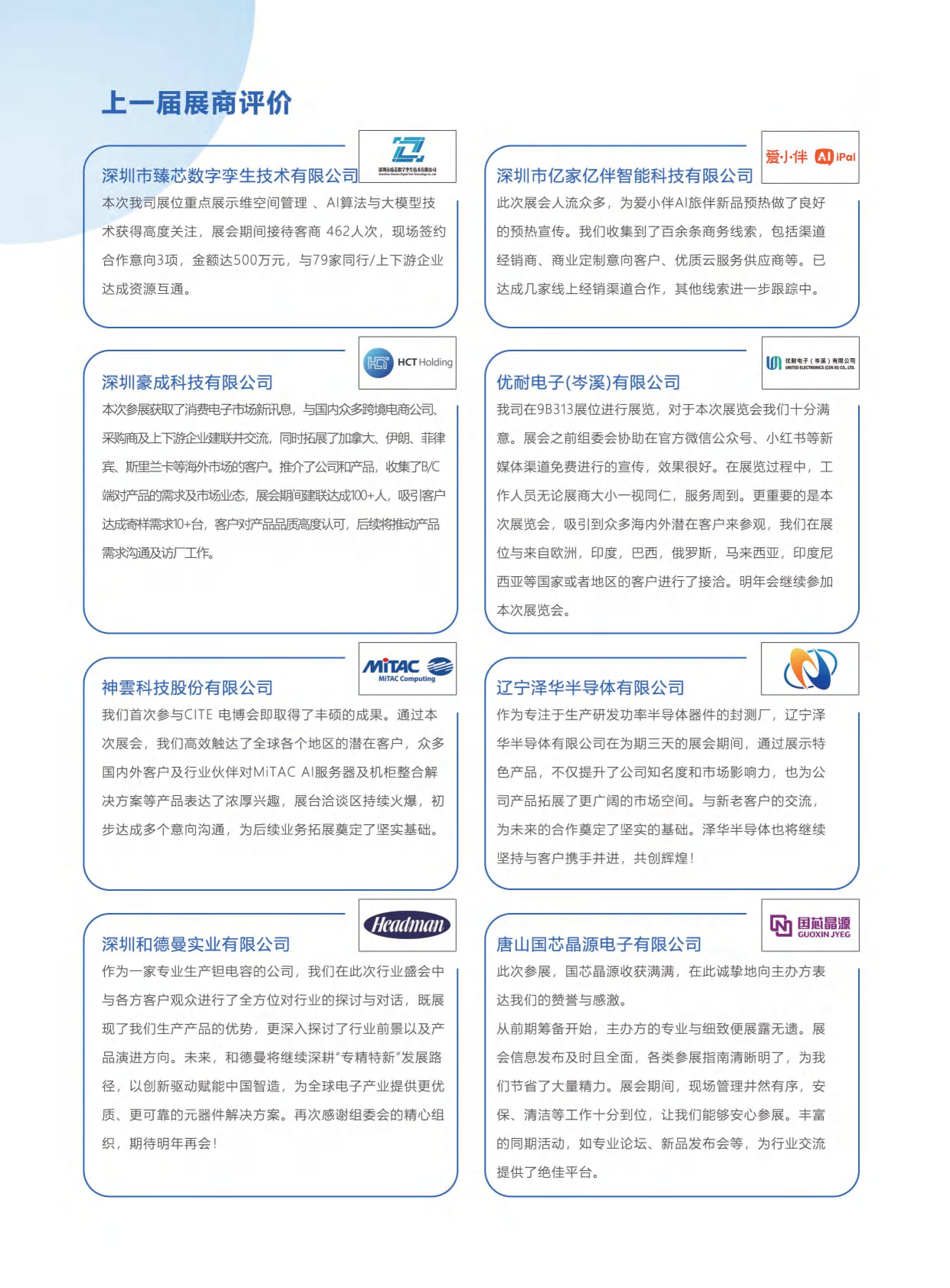 中国电子信息博览会(中文简称:电博会,英文简称:CITE)是中国规模较大、具有国际影响力的电子信息产业盛会之一。经过多年的发展,CITE电博会吸引了来自全球各地的参展商和观众,展示了中国电子信息产业的新成果和技术发展趋势。电博会以“全球视野,国际一流,创新引领,服务产业”为理念, 不仅为中国电子信息产业的国际交流和合作提供了重要平台,同时为产业链上下游协同创新提供了高效交流平台,促进电子信息产业与国民经济各领域进一步融合赋能,推动中国数字经济实现高质量发展。