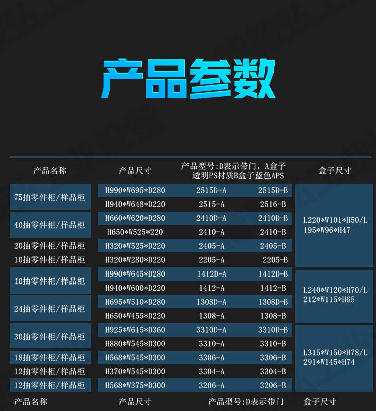 7.抽屉颜色:零件盒、透明零件盒、蓝色零件盒,非标可用铁盒