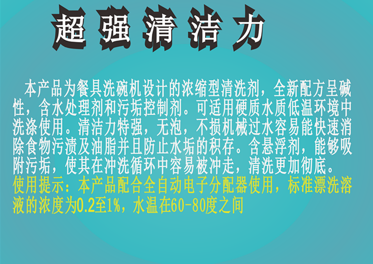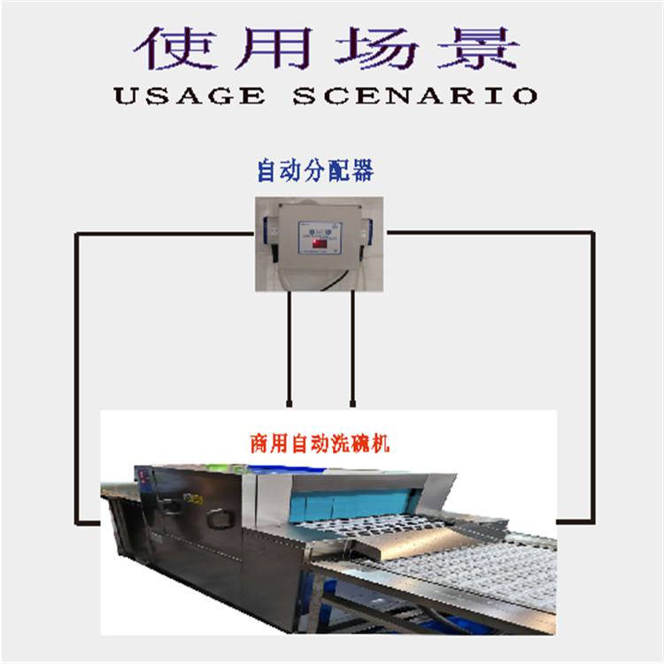 利用全自动分配器输入洗碗机内使用,不需要人手操作,都可保证洗涤效果。标准的浓度0.2%至1%,水温在70℃-80℃之间